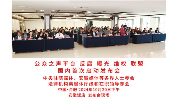 2024年10月20日,公众之声平台曝光、维权、反腐联盟启动发布会在合肥安徽饭店举行。会上,该联盟正式启动,并对外发布联盟宗旨、章程、要求等内容。来自省市县(区)相关单位的负责人,社会各界团体人员、企业及媒体代表参加了此次发布会。