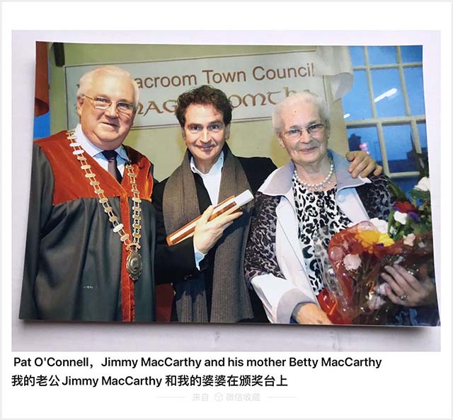 这幅照片是2008年4月,我老公Jimmy MacCarthy因为音乐创作方面的卓越贡献而被他出生的城镇授予“Macroom的钥匙”荣誉称号。他是历史上第三个获此殊荣的人。市长Pat O'Connell邀请我婆婆和我老公一起出席这个隆重的颁奖仪式。Betty MacCarthy,您这位受人尊重被人羡慕的幸福母亲,和自己的明星儿子一起光荣地登上领奖台。